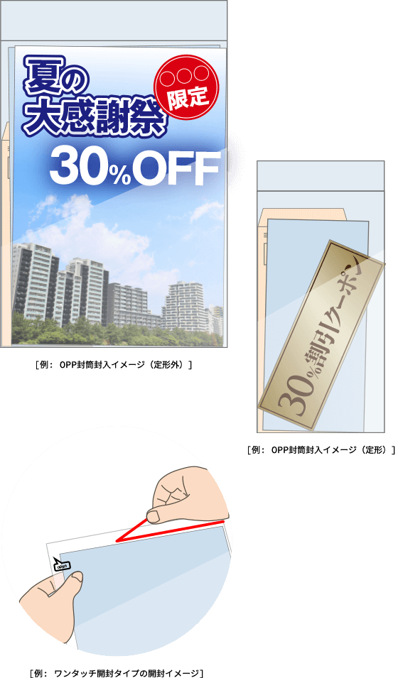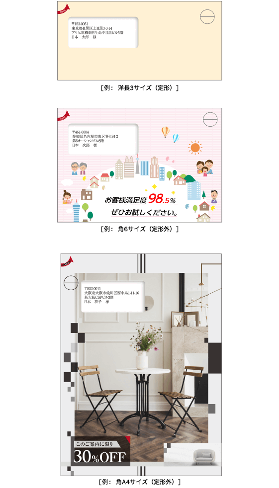 DMレスポでは幅広い要望に応えられるよう、さまざまな形式のDMを取り扱っています。なかでも「タウンメール」「タウンプラス」は、宛名の不要な郵便サービスであり、個人情報の取り扱いがないのでどのような企業でも安心して利用できます。個人情報やセキュリティの面で不安が大きいという場合は、このような提案もできるDMレスポに相談してみてください。DMレスポの封書DMコンテンツ
